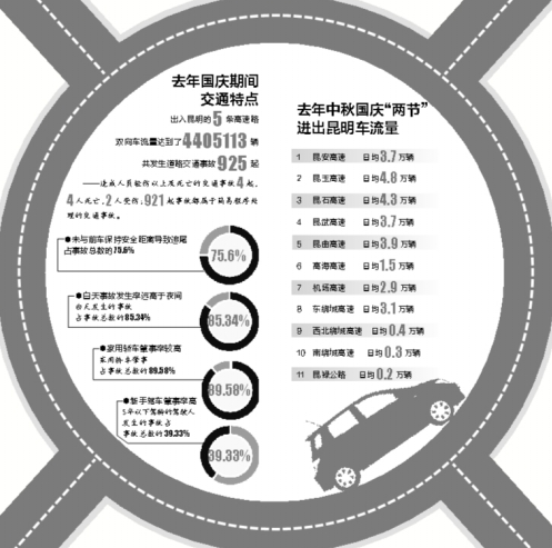 国庆黄金周即将来临,许多市民早早就定好了出游计划,大量车辆集中出城和返城,进出昆明的各出入口通行压力肯定不小,各大高速公路又将迎来出行高峰。哪些时段高速公路免费?怎么避开出城和返城的拥堵?如何在出行中保证行车安全?万一不幸遭遇交通事故时怎样处理?晚报记者请交警等相关部门分析了这两年“中秋”、“国庆”期间的交通特点,给大家出行做个参考。
