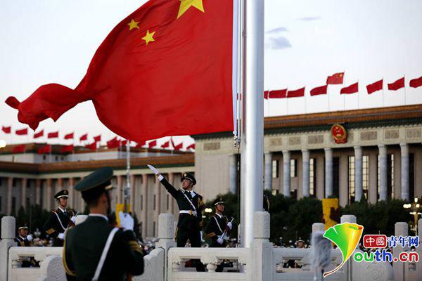10月1日,天安门广场。当日,来自全国各地的数万名群众聚会北京天安门广场,观看升国旗仪式。中国青年网 记者张炎良/摄