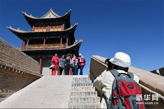 游客在嘉峪关城楼上拍照留念