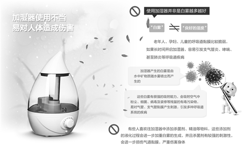 如今,加湿器已经成为很多家庭的必需品,特别是对于有小孩和老人的家庭,加湿器利用率越来越高。“自从今年年初生了宝宝,加湿器几乎天天开着,北方空气太干燥,怕孩子受不了。”在北京从事媒体工作的陈一晗说,“最开始也不懂,直接给加湿器加自来水,后来一位朋友说自来水会产生‘雾霾’,吓得我赶紧换成纯净水来用”。