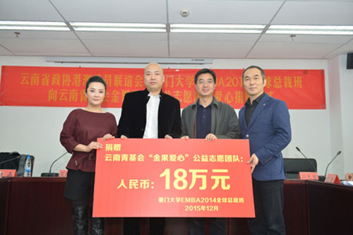 厦门大学EMBA2014全球总裁班向云南省青基会金果爱心公益志愿团队捐赠人民币20万元。