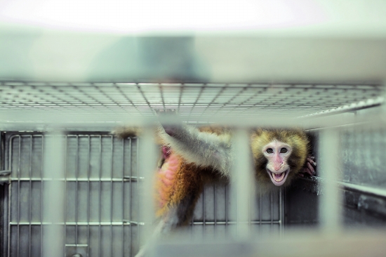 一只猕猴在实验室里接受灯光实验(本版图片摄于12月10日)
