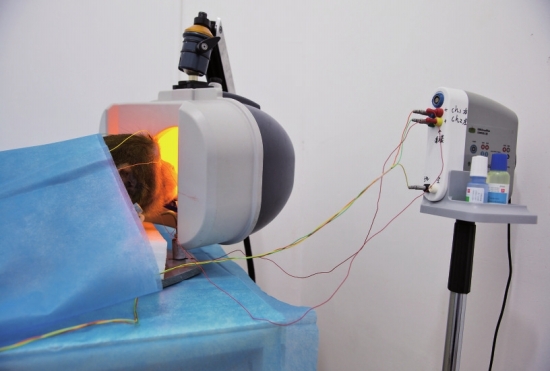 一只猕猴在实验室里接受不同光照条件下视网膜细胞功能测试