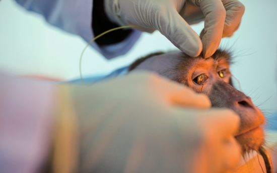 工作人员为一只接受不同光照条件下视网膜细胞功能测试后的猕猴取下安装在眼睛上的电极