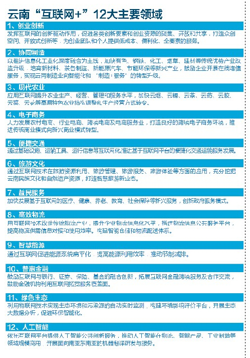 云南是传统资源大省,主要依靠资源要素投入、规模扩张的粗放发展模式,已不适应新常态下发展的要求,亟需转变发展方式。为此,意见中提出,全省要形成更广泛的以互联网为基础设施和创新要素的经济社会发展新形态,突出 “互联网+”创业创新、协同制造、现代农业、电子商务、便捷交通、旅游文化、益民服务、高效物流、智慧能源、普惠金融、绿色生态、人工智能12个主要领域。