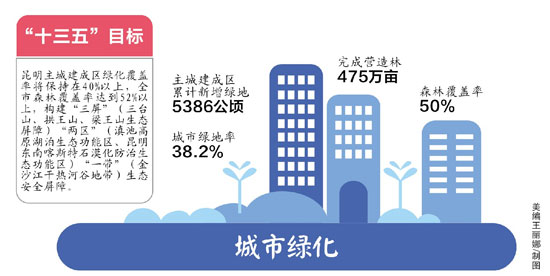 “十三五”期间,昆明主城建成区绿化覆盖率将保持在40%以上,全市森林覆盖率达到52%以上,构建“三屏”(三台山、拱王山、梁王山生态屏障)“两区”(滇池高原湖泊生态功能区、昆明东南喀斯特石漠化防治生态功能区)“一带”(金沙江干热河谷地带)生态安全屏障。