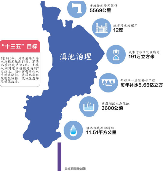 2009年,云南省提出“环湖截污和交通、外流域调水及节水、入湖河道整治、农业农村面源治理、生态修复与建设、生态清淤”六大工程。目前,昆明市政排水管网累计达到5569公里,建成城市污水处理厂12座,环湖截污主干渠97公里及10座配套污水处理厂,城市污水日处理能力由“十五”末的55.5万立方米,增加到目前的191万立方米。