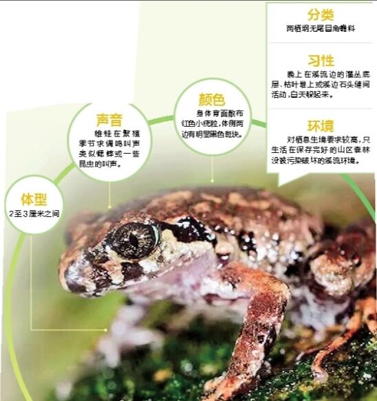 考察队员介绍,与生活在田边河边的青蛙和蟾蜍不一样,腾冲掌突蟾对栖息生境的要求比较高,只生活在保存完好的山区森林里没有被污染破坏的溪流环境。晚上在溪流边的灌丛底层、枯叶堆上或溪边石头缝间活动,白天则躲起来。腾冲掌突蟾的体型很小,且平时藏得隐秘,加上其身体颜色花纹也是和背景融合得很好,所以即便听到它的叫声却并不容易发现。