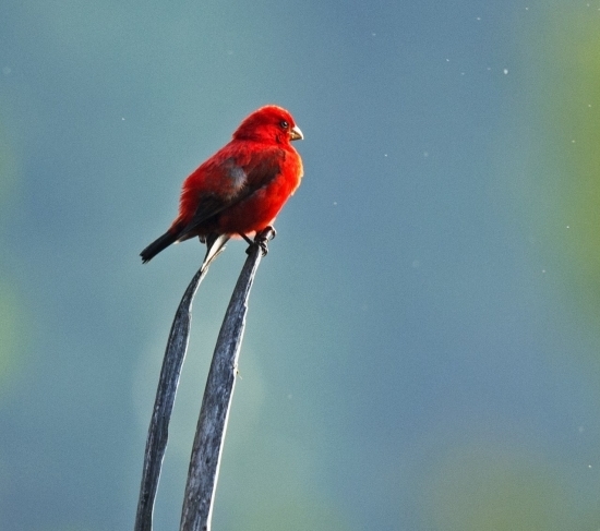血雀是一种垂直迁徙的不常见留鸟,国外分布在尼泊尔、印度、缅甸,国内就只有西藏和云南有分布,而在高黎贡山上生活在海拔500至2000米之间。由于血雀独特的生活习性,能拍摄到通红的血雀是拍摄者最大的幸运。有的爱好者曾数次进山,均以失败告终。