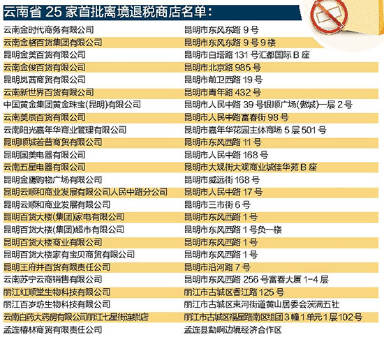 4月1日起,云南省将在试点口岸正式实施境外旅客购物离境退税政策。在昨天召开的云南省境外旅客购物离境退税政策新闻发布会上,云南省国家税务局公布了首批离境退税商店名单,包括百货商场、药店、珠宝店等在内的25家商店位列其中,分布在昆明、丽江、普洱3地。