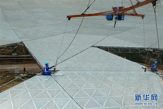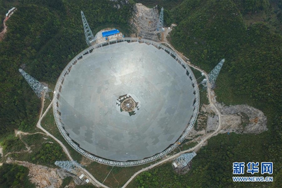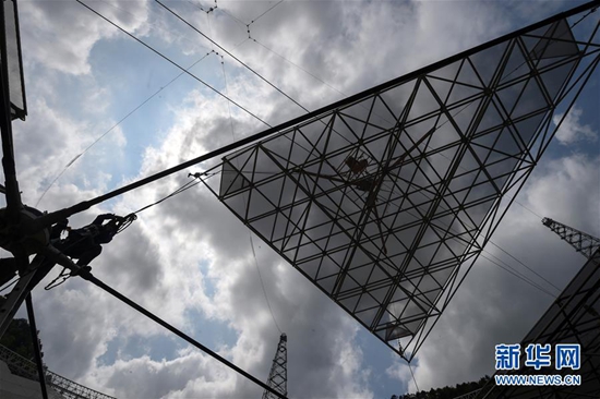 4月10日拍摄的正在建设中的500米口径球面射电望远镜(FAST)工程。截至4月10日,正在贵州省平塘县建设的世界最大单口径射电望远镜——500米口径球面射电望远镜(FAST),已完成4185块反射面面板安装,完成比例达94.04%,工程进入收尾阶段。据悉,FAST的反射面总面积约25万平方米,用于汇聚无线电波供馈源接收机接收,反射面安装工程预计将于2016年5月中旬完成。新华社 记者欧东衢/摄
