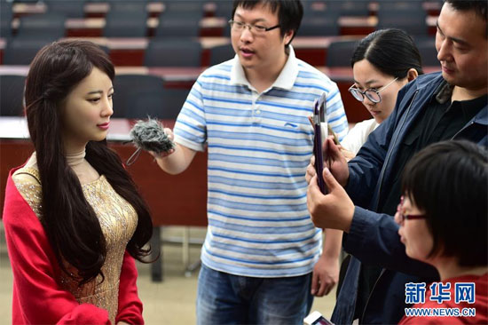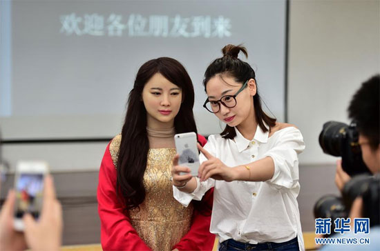 4月15日,在位于安徽合肥的中科大校园,机器人“佳佳”(左)在接受媒体记者拍照。当日,中国科学技术大学正式发布其研制的“特有体验交互机器人”——“佳佳”。“佳佳”初步具备人机对话理解、面部微表情、口型及躯体动作匹配、大范围动态环境自主定位导航和云服务等功能。
