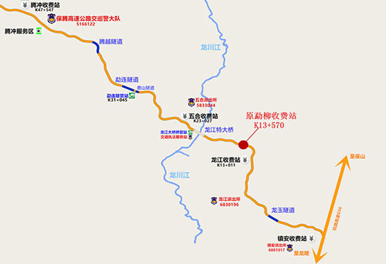 保腾高速2013年初开通除龙江特大桥之外的路段,在保山侧主线上建设了勐柳收费站、在腾冲侧匝道上建设五合收费站,从2013年2月6日开始联网收费。今年4月20日龙江特大桥通车后,主线上的勐柳收费站完成临时主道收费站的使命。经云南公路开发投资有限公司批复同意,保山管理处决定:从5月4日到6月20日期间拆除勐柳收费站,并恢复路面。
