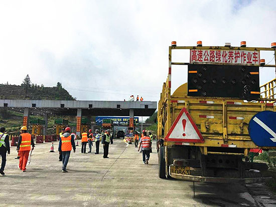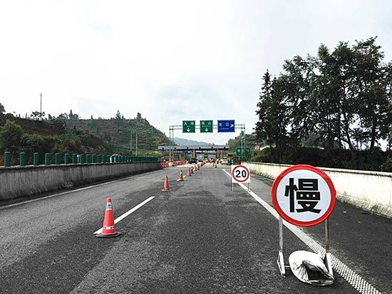 保腾高速公路交巡警大队提示:本收费站位于滇西山岭高速公路,保山至腾冲方向属于下坡路段,施工期间,由于车道压缩,请过往车辆密切注意施工标志牌的提示车辆需按交通标示导行路线行驶,服从现场交警及施工管理人员指挥,行经施工路段车辆车速不得超过30公里/小时,禁止超车。