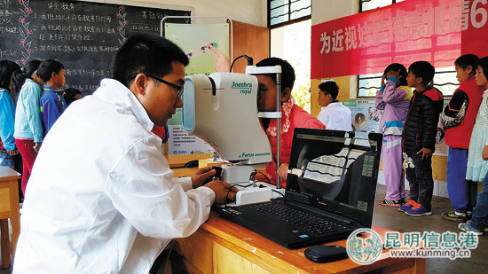 6月6日是第21个全国爱眼日。昨天上午,昆明普瑞眼科医院医护人员来到昆明市联合乡,在寻甸、东川、禄劝三地交界处的法安村小学,为该校45名师生进行眼科义诊。