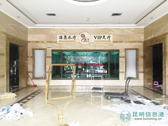 同时,旁边还贴了一份“房屋出租”的通知,欲将该栋房屋出租。透过泉天下温泉酒店紧闭的玻璃门可以看到,酒店内一片狼藉,各种杂物、员工履历表散落地上。