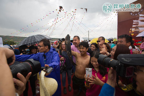 当天,来自四面八方的亲朋好友汇集旧寨村,共同分享“渔人节”的快乐。活动最吸引眼球的是“摸鱼比赛”,成千上万的人集聚到鱼塘边观看比赛,场面热闹壮观。主持人宣布比赛开始,上百名“渔人”鱼贯入水塘,开始摸鱼,有的用网兜、有的用小盆、有的用编织袋,可谓八仙过海各显神通。