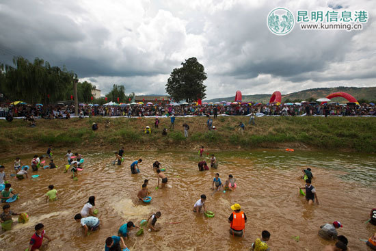 万人狂欢之泥塘捉鱼比赛。