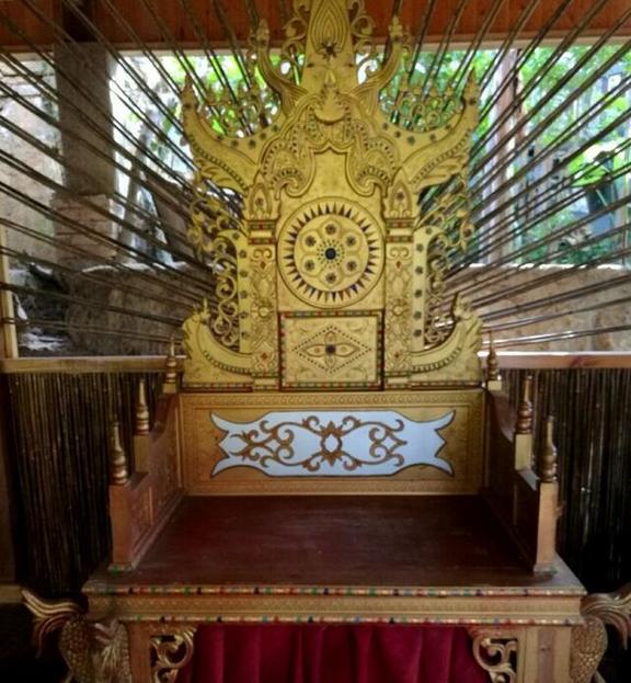 这个座位与众不同,像国王的宝座。这就对了,山庄主人南康先生,是末代布朗族一号头人阿里亚的孙子,也算布朗族最后的王子吧,新中国成立时期有一张毛主席与布朗族二号头人苏里亚握手的照片,而苏里亚,就是南康的舅爷。