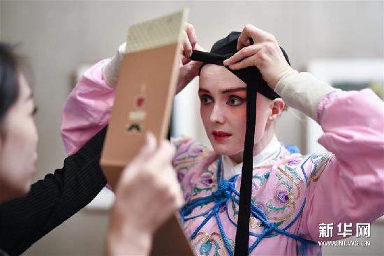 11月28日,在法国巴黎中国文化中心,诺拉在汇报演出开始前穿戴头饰。
