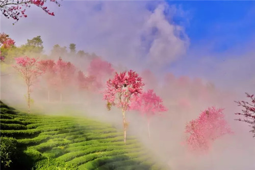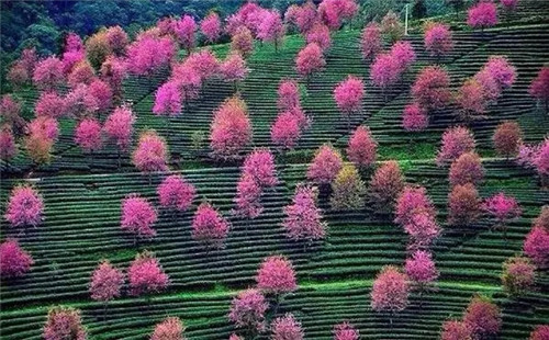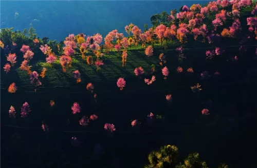 在无量山千亩茶园中,遍地冬樱开放,绚丽非凡,让整个山谷俨然一副油画。碧波荡漾的翠绿衬托着彩霞般的樱花,一派春天景象。走进茶园,那满树云樱,若隐若现的嫩叶,穿梭在樱花林间,或拍照,或慢步,或追逐嬉戏,让人如醉如痴。