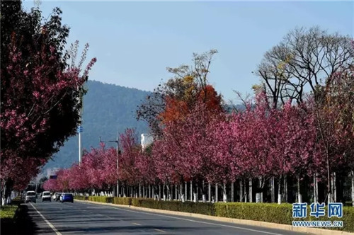 连日来,在昆明龙泉路,冬樱花陆续进入盛花期,一片片染红枝头、花团锦簇的冬樱花把城市街区装点得分外美丽,成为春城昆明迎接新年的靓丽景致。