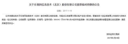 深交所1月19日早间发布公告称,公共传媒出现关于乐视网信息技术(北京)股份有限公司的信息,可能对公司股票交易价格产生较大影响,根据本所《创业板股票上市规则》的有关规定,经公司申请,公司股票(证券简称:乐视网,证券代码:300104)于2017年1月19日开市起停牌,待公司通过指定媒体披露澄清公告后复牌,请投资者密切关注。