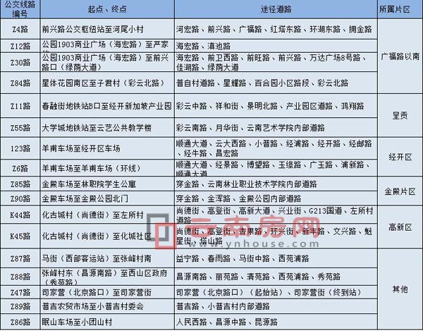除广福路以南片区,呈贡、经开区外,金殿片区、高新区、、马街、眠山车场、司家营片区也新增了几条公交线路。