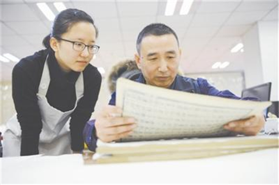 2月27日,北京的春天来得有些早,温暖的阳光透过古朴而明亮的茶色玻璃窗洒落在国家图书馆幽静的长廊内,沿着蜿蜒曲回的廊道,记者终于在这座亚洲最大的图书馆一层拐角处找到了修复师们的工作地——国图古籍馆文献修复室。