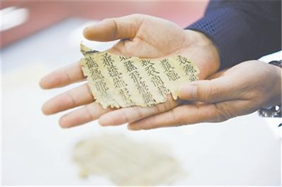 修复师向记者展示即将修复的一页西夏文古籍,据估测距今有500多年的历史。