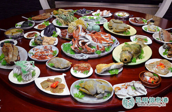 “满汉全席翡翠宴”是翡翠精雕作品,由玉雕大师邹万通历时十年,将坚硬的顽石人工雕琢成50道美食,每一道“菜肴”的外形、色泽,均达到了逼真境界,以假乱真到令人叹为观止。