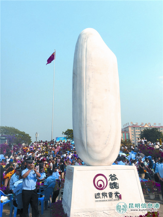 产于芒市遮放镇的遮放贡米,色泽白润如玉,米饭清香可口,软滑适中,粘而不稠,泠不回生,营养丰富。自元朝始,被历代王朝指定为土司进贡之物,年有定量。这次亮相的遮放贡米雕塑高4.7米、宽1.58米、厚1.13米,材质为汉白玉,整体雕塑采用圆雕、写实、非着色的手法雕刻而成。雕塑造型灵感来源于遮放贡米一粒米的原始形态,大气而沉稳。