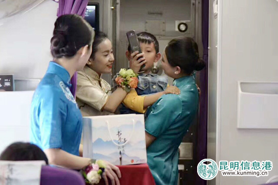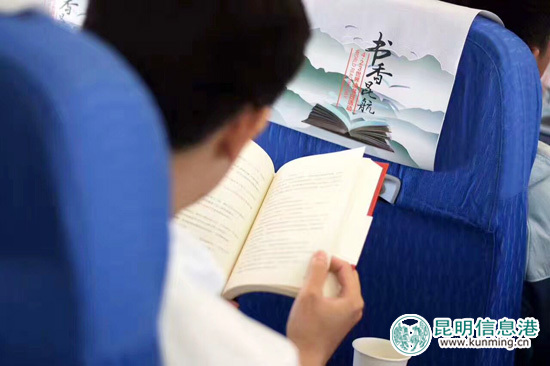 登上昆航机舱,书吧一般的现场布置、身着旗袍的昆航“阿诗玛”乘务员、伴着音乐的声声朗诵……整个航站楼变成了书香弥漫的图书馆。