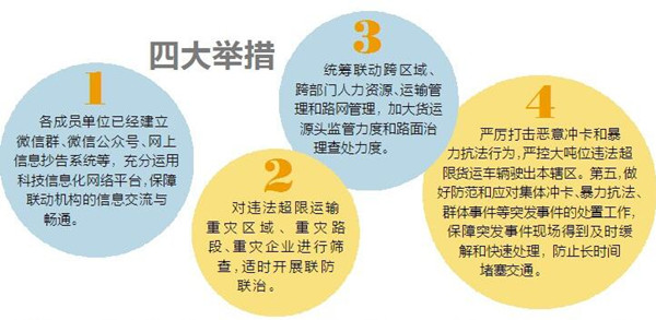 据悉,滇中城市群的治超办已达成共识,在暑假开始之前及之后,省内省外物资交流处于高峰阶段,在辖区交界处的重点防控路段,主要采取流动治超的方式,对过往非法超限超载运输车辆进行重点检查,严格按照《公路安全保护条例》的规定,严格执行“一超四罚”的规定,即对1年内违法超限运输超过3次的货运车辆和货运车辆驾驶人、1年内违法超限运输的货运车辆超过本单位货运车辆总数10%的运输企业实施处罚,并按照《道路运输条例》的规定,对货运场所经营者实施处罚。
