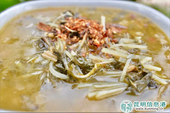 “干巴回锅洋芋”用的是“宣薯2号”洋芋,切片的洋芋稍稍炸一下,再和风干的牛干巴同炒,一个松软一个酥脆。煮汤用的是“丽薯6号”洋芋,水分高、质感脆,煮出汤来不黏稠,调味加的是当地腌制风干的干板菜,口味清淡,柔和、微甜,酸味在喝下汤后慢慢泛出,这是经历阳光、风干和时间酝酿后才有的滋味。