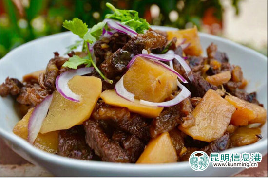 六哨的“牛肉炖洋芋”也因为选材的不同,有不一样的味道。除了选用淀粉含量高的新鲜洋芋,牛肉也来自本地黄牛,吃的都是天然草料,没有人工饲料添加,肉质自然鲜美。