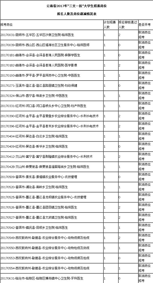 根据云南省“三支一扶”协调管理办公室6月5日发布的《关于云南省2017年“三支一扶”大学生招募岗位需求裁减的公告》显示,共计25个招募需求岗位审核通过人数与招募人数之比未达到3:1的开考比例,按《云南省“三支一扶”大学生招募公告》规定,这25个岗位被取消岗位招考。未达开考比例的多为专业性较强的支医类和支农类岗位,这些岗位涉及昆明市、曲靖市、红河州、普洱市、西双版纳州、文山州、玉溪市和保山市的多个县区。其中,包括昆明市西山区福海社区卫生服务中心招募的临床医师在内的8个岗位,均没有考生报名。