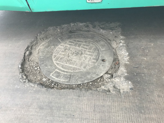 14日中午,记者留意到华夏中专公交车站前的两个下沉井盖已经得到维修。