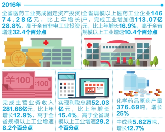 记者从省工信委获悉,2016年,全省医药工业稳中有进、稳中向好,实现了“十三五”良好开局,全省规模以上医药工业企业146户,完成工业增加值113.07亿元,比上年增长16.9%,高于全省规模以上工业增速10.4个百分点;完成主营业务收入281.66亿元,比上年增长12.9%,高于全省规模以上工业增速8.2个百分点;实现利税总额52.03亿元,比上年增长15.4%,高于全省规模以上工业增速29.2个百分点。化学药品原药产量376.69吨,增长25%;中成药5.62万吨,增长12.7%。