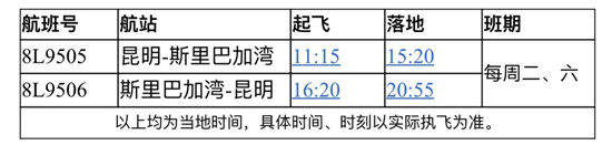 昆明-斯里巴加湾航班号为8L9505/6,由A320/B737执飞,每周二、六各一班。具体时刻信息如下:
