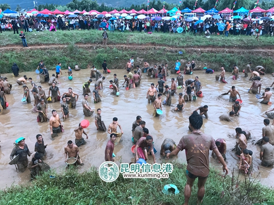 最令人瞩目的依旧是放鱼仪式与千人烂泥塘捉鱼比赛,随着鱼儿的入塘,参赛选手们的热情也被点燃起来,裁判一声令下,如万箭齐发,大家一拥而入,在泥塘里争先恐后的抢抓鱼儿。一眼看去,选手们都弓着身子甚至卧在水里专心致志的“摸鱼”,上演一场正宗的大规模的“浑水摸鱼”,其间“渔王”的诞生更是把全场气氛推向高潮,捉得鱼王,不仅可以领取丰厚的奖品,更意味着这一年里会好运连连,顺风顺水。