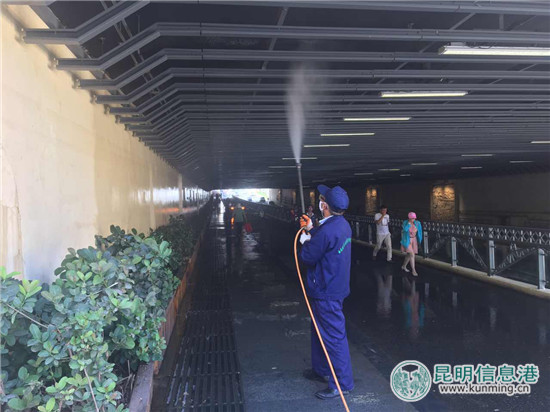 近日,昆明遭遇强暴雨袭击,城区多地段出现渍水。大雨渍水过后,蚊虫易滋生,由此可能会引起虫媒性疾病及肠道传染病、皮肤病等。为防止疫病感染,盘龙区卫计局迅速启动应急防疫工作。26日一早,盘龙区卫计局在全区开展渍水点消杀工作。记者来到北站隧道,只见工作人员拿着工具,开始四处喷洒消毒液。此外,针对北站隧道、金星立交桥、清水潭小区、鼓楼路木材厂宿舍等多个严重渍水区域,盘龙区卫计局请了专业的消杀公司进行消灭杀处理。