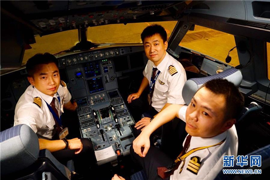 9月8日,东方航空公司的责任机长尚峰(中),机长曲伟成(左)和观察员陈冠南(右)在驾驶空客A320,进行验证飞行后,拍照留念。记者邢广利/摄