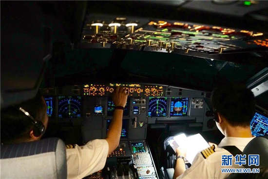 9月8日,东方航空公司的责任机长尚峰(右),机长曲伟成(左)在驾驶空客A320,进行验证飞行。记者邢广利/摄