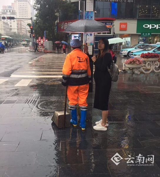 此外,在正义坊北馆路口也发生了感人一幕。上午10点左右,网友@成都小郡肝串串称,昆明一名漂亮的小姐姐雨中打伞护送环卫阿姨过红绿灯,一直送到对面的商铺屋檐才离开。此信息被发布到微博上后,获得了多名网友评论和点赞,称这是满满的正能量。(记者 熊强)