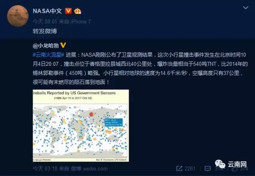针对这一“神奇”现象,美国加州理工学院从事近地小行星研究的博士后研究员叶泉志称,据NASA近地小行星研究中心数据库公布的卫星观测结果,这次小行星撞击事件发生在北京时间10月4日晚20时7分,撞击点位于香格里拉县城西北40公里处,爆炸当量相当于540吨TNT,比2014年的锡林郭勒事件(450吨)略强。小行星相对地球的速度为14.6千米/秒,空爆高度只有37公里,很可能有未燃尽的陨石落到地面。因小行星撞击会产生冲击波传到地面,事件发生地距离香格里拉县城较近,不知当地居民是否受到影响。