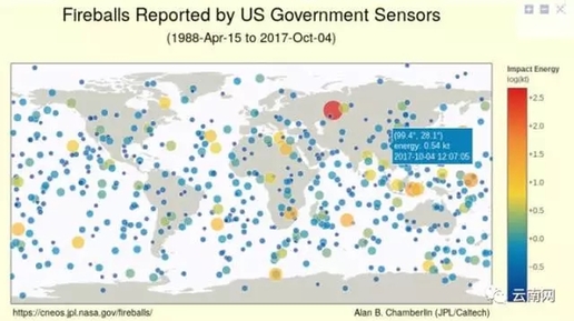 NASA发布的自1988年-2017年全球范围内小行星撞击事件的分布图及详细情况