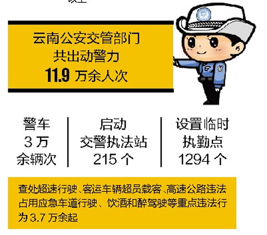 查处超速行驶、客运车辆超员载客、高速公路违法占用应急车道行驶、饮酒和醉驾驶等重点违法行为3.7万余起。1日至7日,在云南全省高速公路收费站、服务区和旅游景区主干道上设置临时快处快赔服务点118个,共处理1753起简易事故,共接报适用一般程序处理的道路交通事故151起。