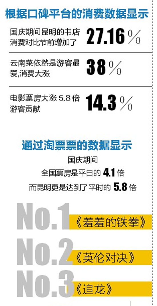 阿里巴巴旗下的本地生活服务平台口碑的数据显示,国庆期间昆明消费者使用支付宝在线下支付的金额,是去年国庆的2.46倍。对比节前同期消费增幅达到5%,游客贡献了其中的23.31%。所有消费类目中,美食、购物、电影增幅最为显著。