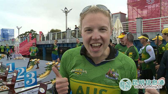 “来昆参加比赛对我们来说是一次十分特别的全新体验。”澳大利亚姑娘Eliza Campbell表示,龙舟在澳大利亚很受欢迎,是近年来发展最为迅速的一项运动之一。队友们来自全国各地,最小的17岁,最年长的已经71岁。